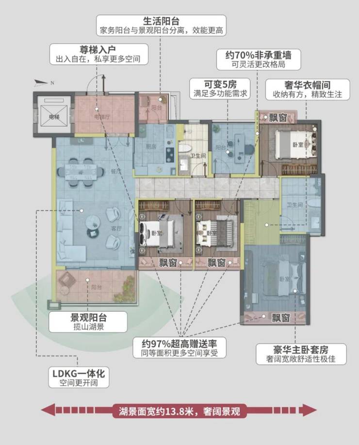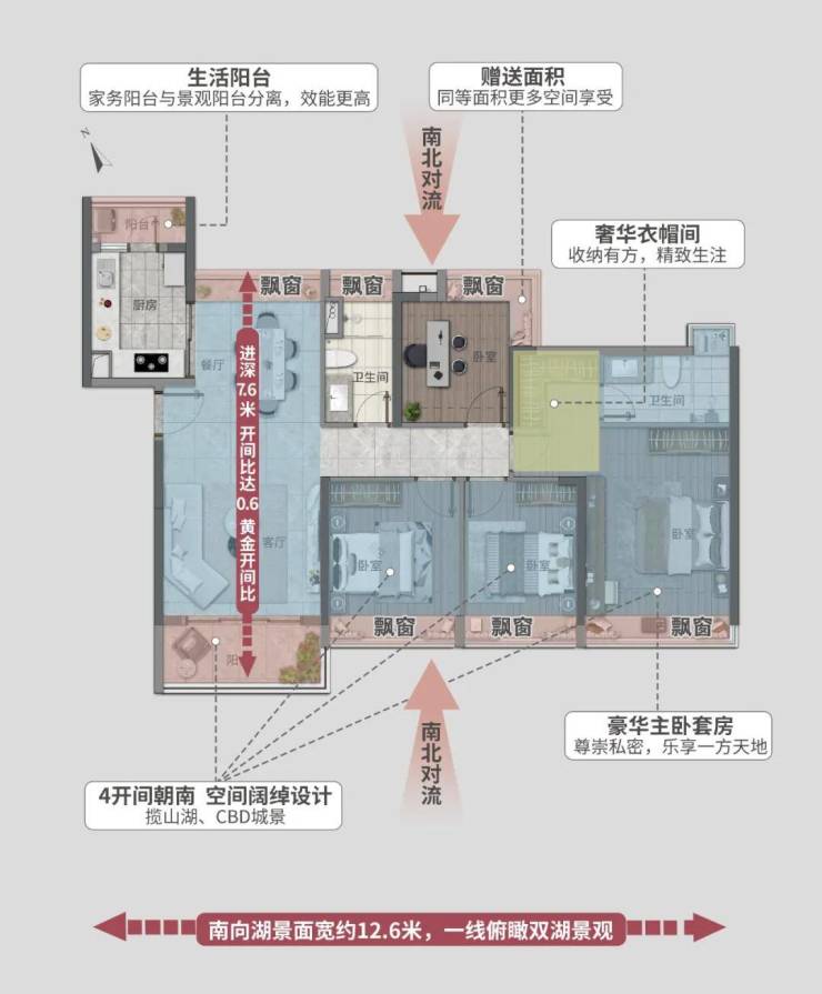 南向约13.8米超阔南向面宽,匹配无遮挡的IMAX级景观视野,外面湖水波光粼粼,室内阳光为伴、清风徐徐,人何等自在。