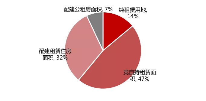 土地出让中,以竞自持租赁住房面积为主,占比达47%;其次为配建租赁住房和配建共租房面积,占比分别为32%和7%;纯租赁用地占比较少,只有14%。图:22城首批集中出让涉租赁地块成交方式占比