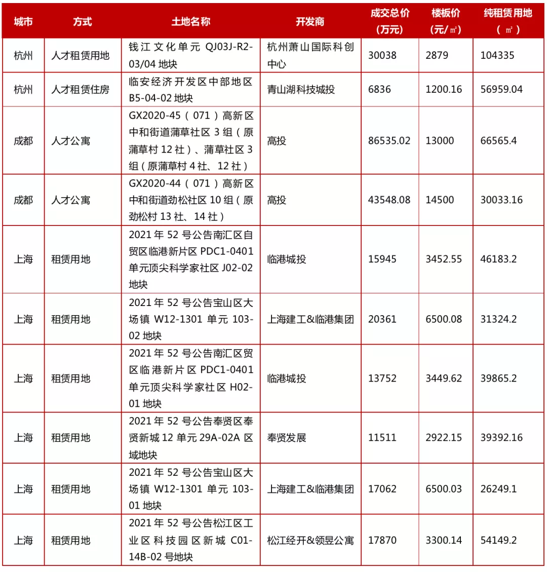 纯租赁用地:目前市场上纯租赁用地供应及成交均相对较少,主要集中在上海、杭州、成都等核心城市,拿地主体以国企央企为主,首批次纯租赁用地成交仅有12幅,合计总建面55.62万㎡。预计未来将有大量租赁用地问世,在“租售并举”的大背景下,高品质的大型租赁社区将离我们越来越近。首批次纯租赁用地出让情况
