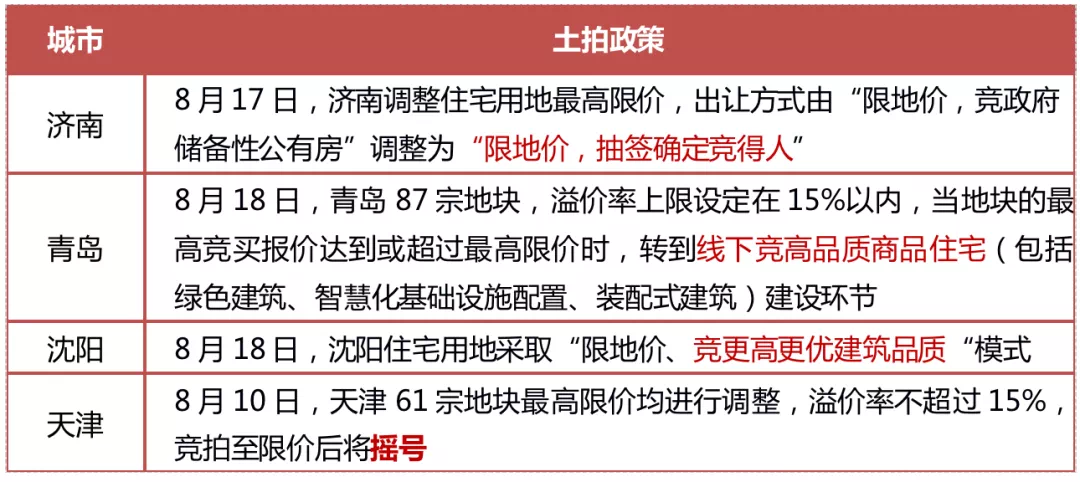 8月10日,自然资源部发布土地新规:1)参与商品住宅用地竞买企业应当具有房地产开发资质;2)建立有效的购地审查制度;3)单宗住宅用地溢价率不得超15%;4)不以竞配建等方式增加实际地价,可通过竞一次性合理报价、摇号、竞更高更优建筑品质方式确定竞得人。