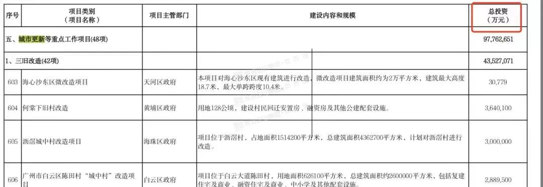 海珠区既包含旧村改造,也涉及旧厂房、旧园区的更新改造,沥滘村、新市头村、石溪村、赤沙村等旧改项目在列,个别项目投资金额高达300亿元之多。