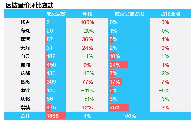 外围区除花都录得个位数交易外,其余三个主力区成交保持活跃。其中,番禺、黄埔区环比各上涨24%、78%,交易增长主要来自恒大冠珺之光、碧桂园星悦台两个活动促销项目,分别贡献29套、31套。