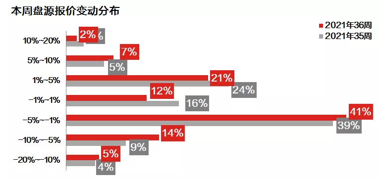 整体看,本周报价下调1%-5%之间的盘源占40.8%,较上周上升1.9%。而报价上调1%-5%以内的盘源占比则较上周减少3.1个百分点,共占20.7%。另外,本周报价上调5%-10%的盘源环比净增1.4个百分点,共占6.9%。