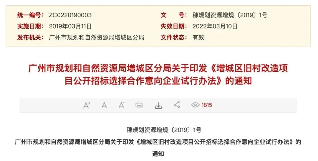 增城早前被废除的《增城区旧村改造项目公开招标选择合作意向企业试行办法》文件就是其中的例子。