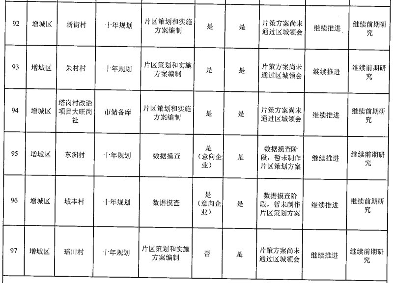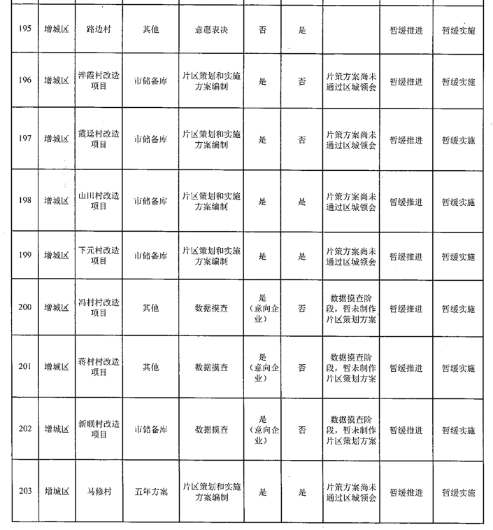 其中,增城有1个已批复需完善手续项目(群星村);1个已批复需优化方案项目(南坣村);一个已批复需重新报方案项目(简村村)。