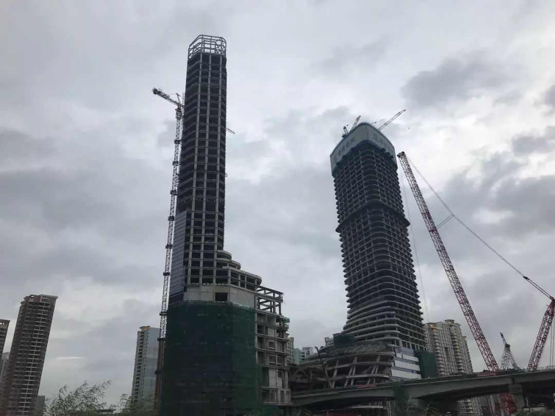 目前正进行地上部分结构施工,进度为西区塔楼建至46层(封顶),东区塔楼建至36层(封顶),城际部分建至2层。