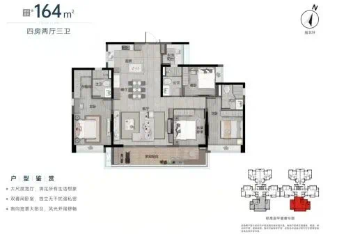 户型设计上也是不错,采用双主套设计,居住舒适度和私密性大大提升。四开间朝南,通风采光性能同样不错。