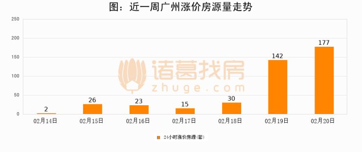 根据诸葛找房数据显示,广州24小时涨价房源量为177套,较02月19日增加35套,环比上涨24.6%。与此同时,涨价房源占比小幅扩大,业主信心有所提升。