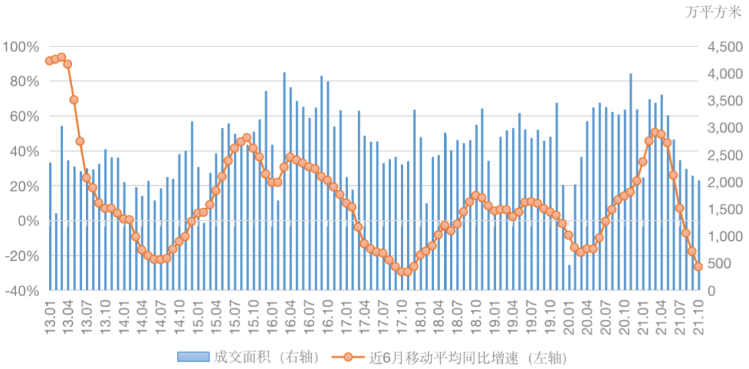从近6个月新建商品住宅移动平均同比增速来看,11月,成交增速曲线降幅扩大8.8个百分点至-26.4%,已接近10年来历史较低位。