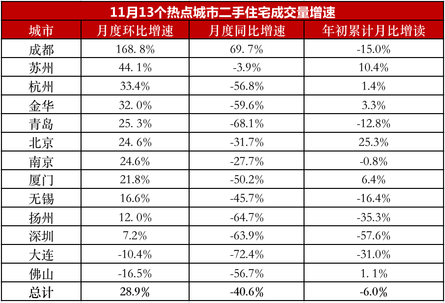 今年下半年以来,随着调控政策和信贷环境的持续收紧,全国二手住宅市场形势急转直下,成交量连续多月快速下滑,部分城市单月成交量甚至连创多年新低。至11月,多个城市二手房成交量环比出现明显增长,结束下半年以来二手房成交量价齐跌的态势。