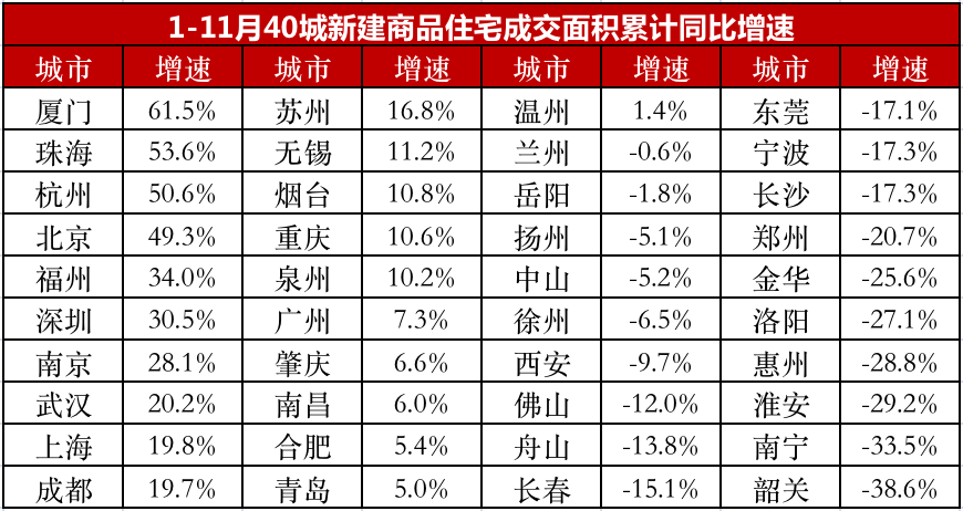 表:1-11月40城新建商品住宅成交面积累计同比增速