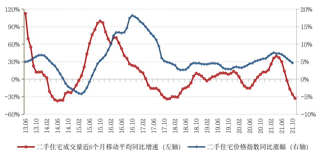 实际上,整体走势具有很强的周期性,2020年上半年受疫情影响,成交增速曲线在历史较低值附近震荡,7月开始上行,至2021年4月见顶后持续回落,随后三季度以来,调控组合拳下,40城新房成交量近6个月移动平均同比增速于9月份首次转负,随后市场情绪持续快速回落。