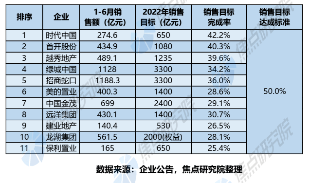 五、房企目标完成情况:上半年销售目标完成不及预期,时代中国完成率较高