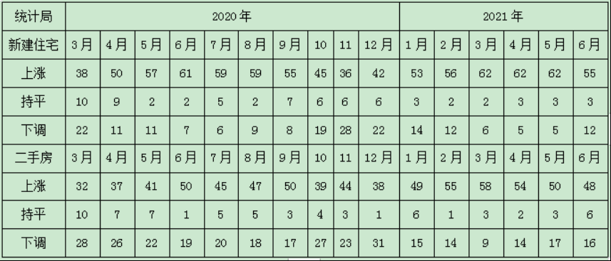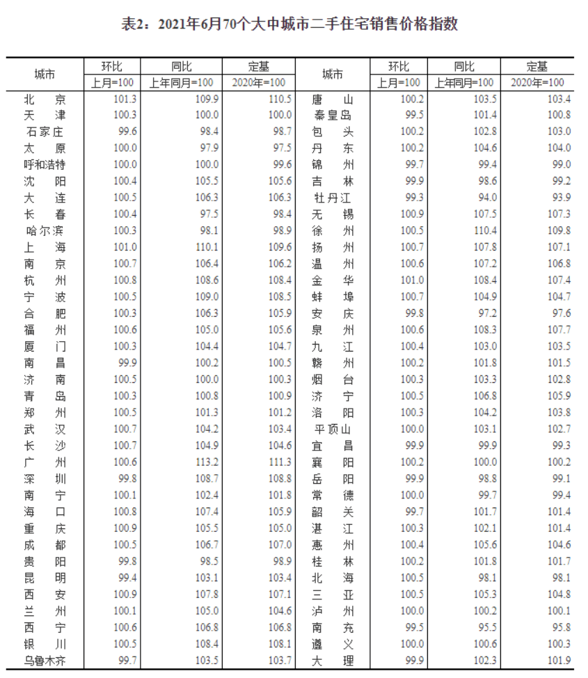 从国家统计局7月15日发布的2021年6月份70个大中城市商品住宅销售价格变动情况看,6月份70城中只有48个城市的二手房价格环比上涨,达到今年以来的较低值(3月份有58城二手房涨价)。