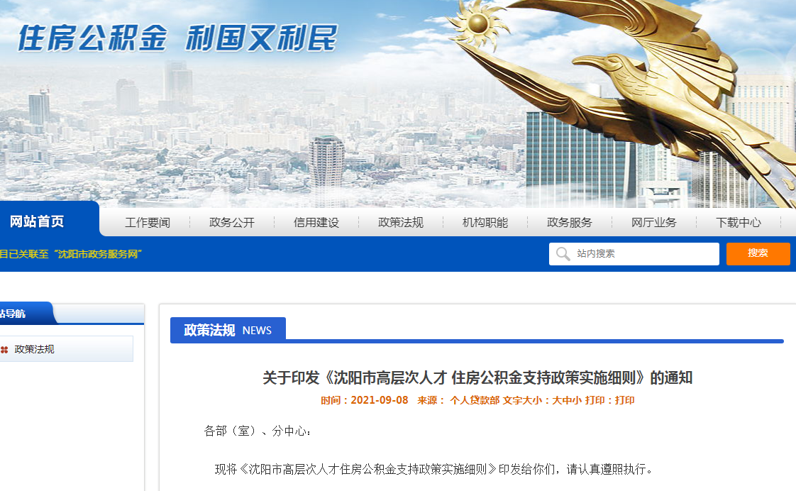 9月8日,辽宁省沈阳住房公积金管理中心印发《沈阳市高层次人才住房公积金支持政策实施细则》。高层次人才和经认定的其他符合条件人才首次使用住房公积金贷款在沈购买首套自住住房的,贷款限额较高可放宽到当期贷款较高限额的1.5-4倍。《细则》自印发之日起执行,暂行三年。