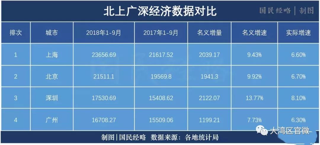 其实,无论是从GDP总量还是经济竞争力上,深圳发展势头都相当强劲。在2018年前三季度经济数据中,深圳以8.1%的实际增速在一线城市里遥遥先进,同时以822亿的差额,扩大了广深之间的GDP差距。