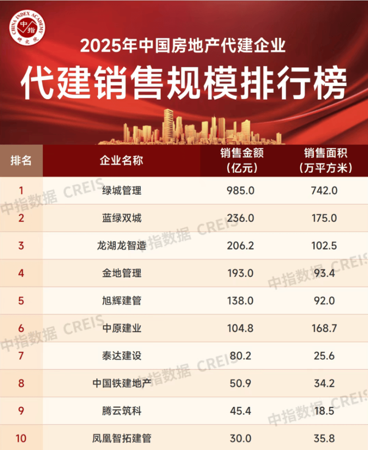 1月6日晚间,中指研究院发布的《2025年中国房地产代建企业新签规模排行榜》显示,2025年,绿城管理以3535万平方米新签约规模位列第一,遥遥领先。旭辉建管和润地管理代建新签约面积分别为1629万平方米和1595万平方米,旭辉建管位列二、三位,处于领先地位。