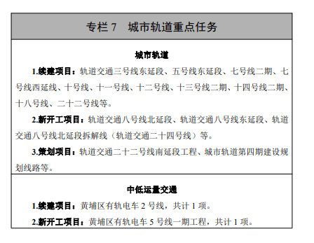 同时,加密主城区普速轨道线网,提高轨道交通服务覆盖,完成地铁5 号线东延线、10 号线、11 号线、12 号线等 4 条城市轨道交通建设;新开工建设地铁 8 号线北延段、8 号线东延段、24号线等第三期建设规划调整线路。