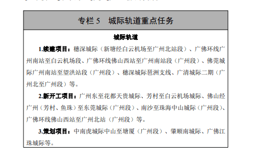 构建互联互通的城际铁路网络方面,加快建设广佛环线广州南至机场段、广佛环线佛山西站至广州南站段(广州段)、广清城际二期(广州北至广州段)、佛莞城际(广州南至望洪段)、穗莞深城际(新塘至白云机场段)、穗莞深城际琶洲支线等 6 条城际铁路,研究推进广佛环线佛山西至广州北段(广州段)、中南虎城际、肇顺南城际、广佛江珠城际,形成“环+放射型”城际铁路骨架网络,强化枢纽区域辐射能力,提升与湾区核心城市的连通水平。