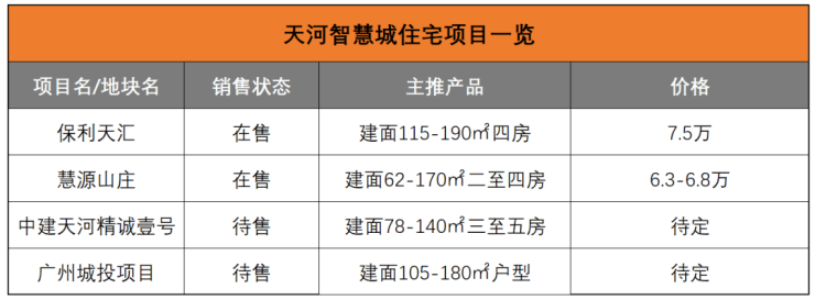 目前板块内新盘不算多,离城投天河智慧城地块项目最近的项目为保利天汇,目前销售已过半,主推建面115-190㎡四房,在售均价6.2-8万/平。