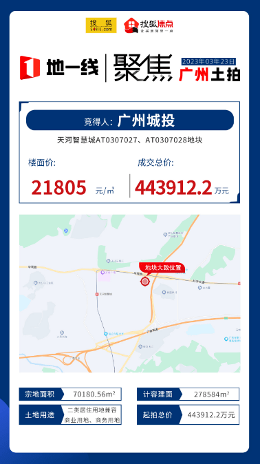 今年3月份,广州城投拿下天河智慧城AT0307027、AT0307028地块,总价44.3亿元,折合楼面价21805元/㎡,实现了广州地市今年的开门红。