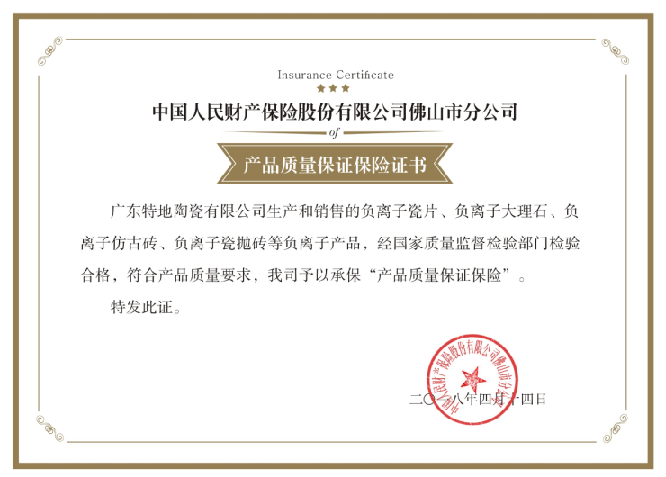 2004年,特地携手中山大学共同研发出负离子瓷砖;2007年,荣获国家发明专利技术【专利号ZL200410079022.8】;2017年,特地成为负离子瓷砖“团标、行标、国标”三大标准起草编制单位。且2017年特地把负离子大理石瓷砖TDZF11380PS送往广东省微生物分析检测中心,检测结果显示,特地·负离子瓷砖甲醛去除率达92.2%,甲苯净化率达95.6%,TVOC去除率达94.9%,氨去除率达92.4%;(以上检测数据仅对本次送检结果负责),与此同时,特地·负离子瓷砖负离子系列产品均由中国人民财产保险承保(起止时间:2018年4月14日-2019年4月13日),经由第三方国家权威认证机构检测无产生负离子将全额退款。