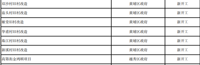 今年新开工的旧村改造项目包括黄埔区双沙村、庙头村、姬堂村、华甫村、珠江村、新溪村以及越秀区高第街金鸿顺项目。