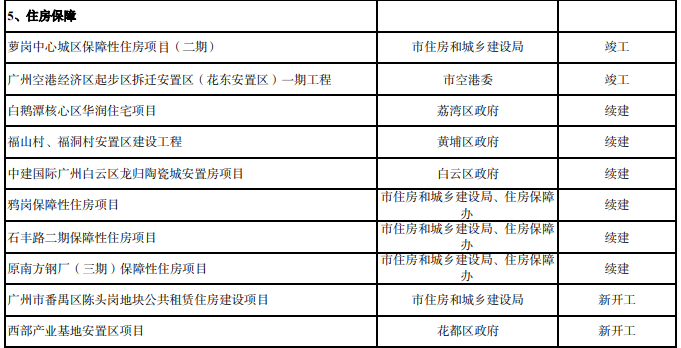 住房保障方面,萝岗中心城区保障性住房项目(二期)、广州空港经济区起步区拆迁安置区(花东安置区)一期工程力争竣工。