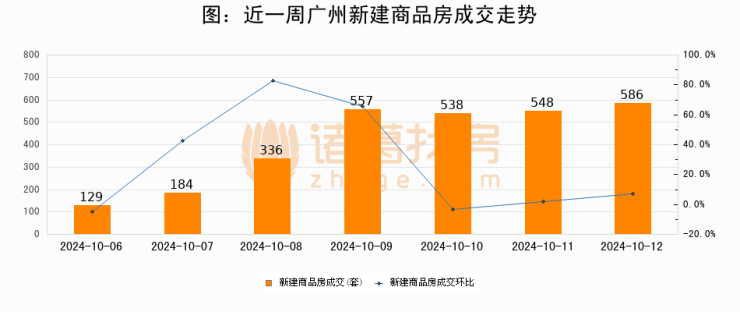 根据广州市住房和城乡建设局数据显示,2024年10月12日广州新建商品房成交586套,较昨日增加38套,环比上涨6.9%