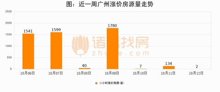 根据诸葛找房数据显示,广州24小时涨价房源量为2套,较10月11日减少132套,环比下降98.5%。与此同时,涨价房源占比小幅回落,对于购房者来说是一个入市窗口期,购房者可抓住时机入市。