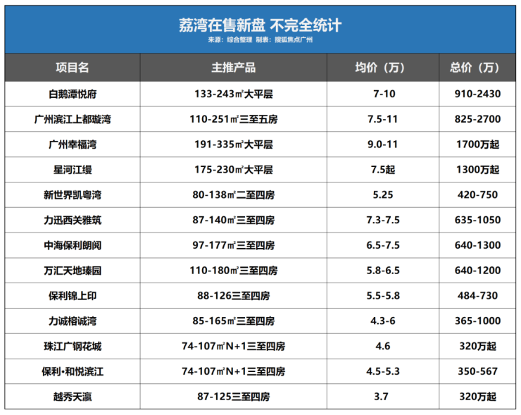 当然荔湾也不是所有版块都可以选,以下是小狐君不完全统计的荔湾在售新盘,发现三字头项目屈指可数。