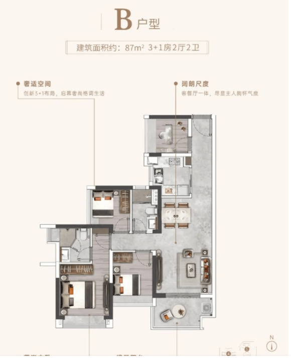 87㎡爆款四房,主卧带有私人卫浴,卧室带有多飘窗设计,双开间朝南,采光及通风不错。