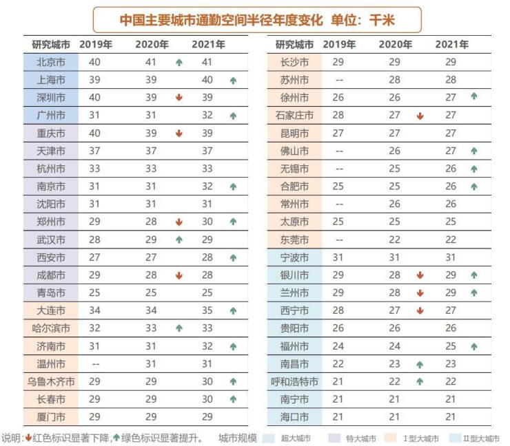 需要注意的是,通勤半径受到建成区面积、人口规模、地形地貌、规划水平、房价水平等多种因素的影响。