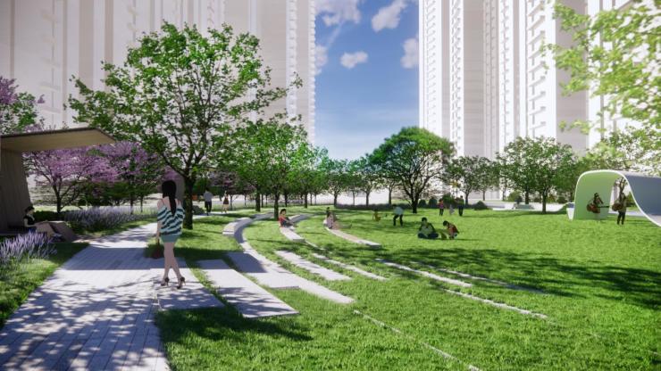 约100米阔尺楼间距让社区清风对流,阳光缱绻,抬头蓝天白云,出门美景花园。归家之路移步易景,景观层层递进,全龄生活美好兑现。