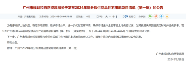 广州市自然资源局官网公布了《广州市2024年部分拟供商品住宅用地项目清单(第一批)》