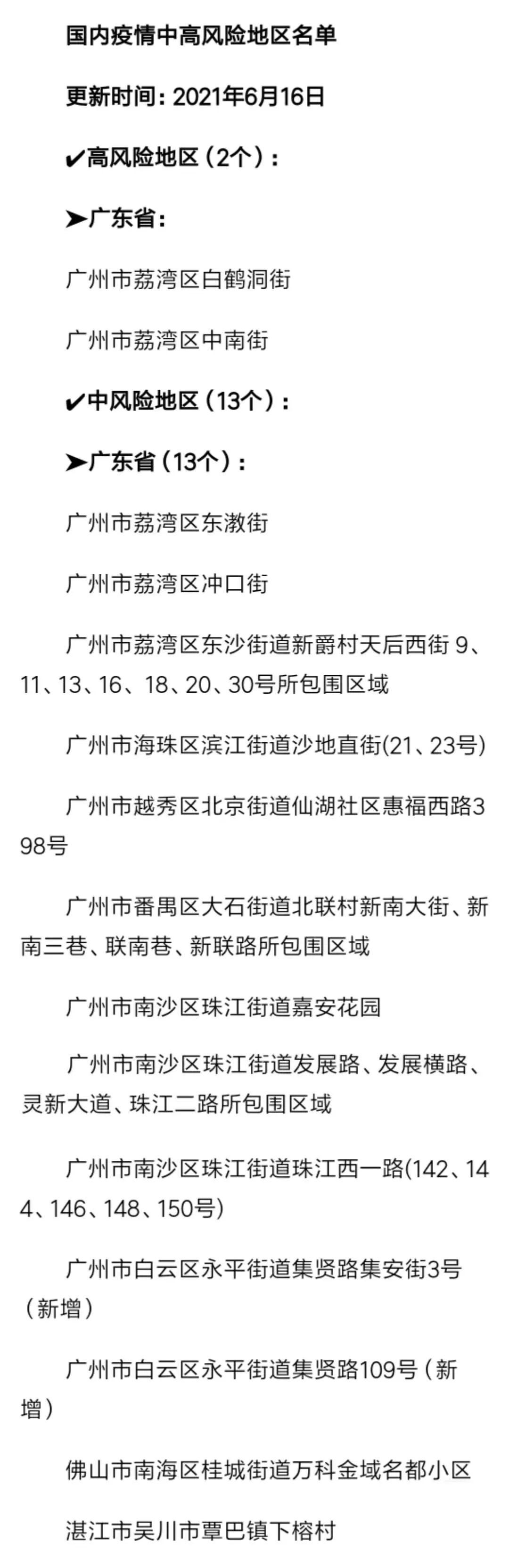 截至2021-06-16 全国共2个高风险等级地区,13个中风险等级地区。