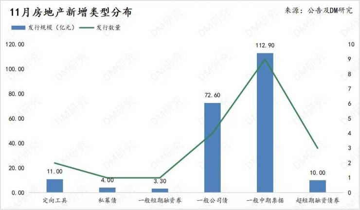公司债及中期票据依旧是当下房地产行业融资主要工具。11月上述两渠道分别发行72.6亿元和112.9亿元,占比当月发行总量的33.96%和52.81%;发行类型与10月基本一致,净融资为67.37亿元,较10月同比下降61.8%。
