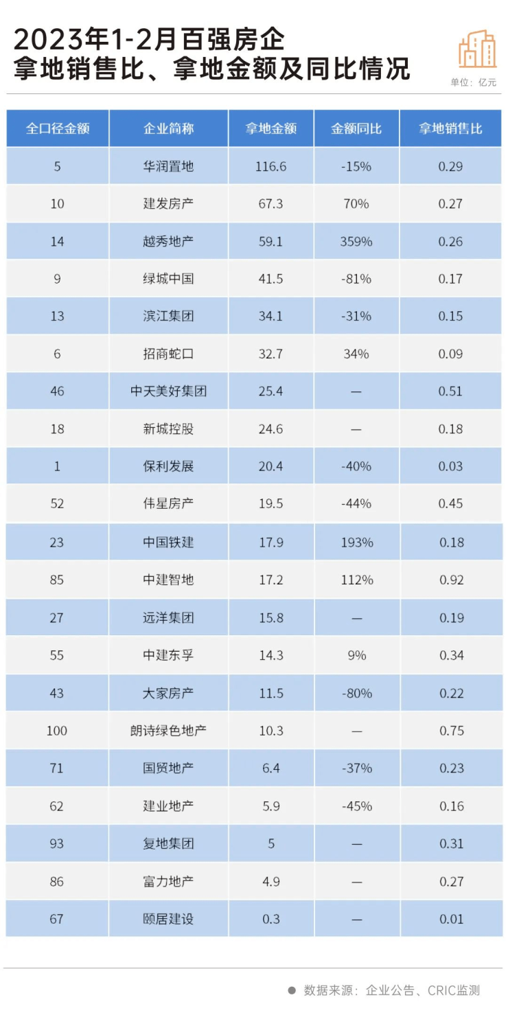 聚焦销售百强房企,前2月超过两成百强房企在土地市场纳储,与1月仅零星百强拿地形成鲜明对比。