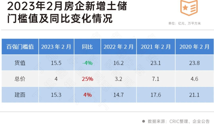 首先表现在投资百强门槛的回升上,二2月末投资百强房企新增土储货值门槛为15.5亿元,同比微跌4%,但总价、建面百强门槛分别为4亿元和15.3万平方米,同比上涨25%和4%。