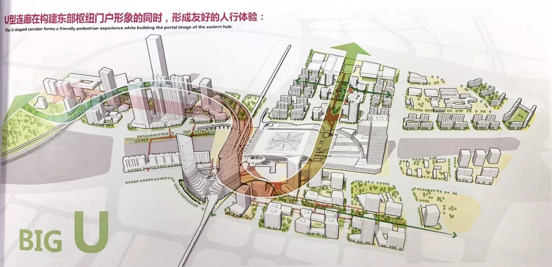 为此,广州东部交通枢纽中心片区城市中,更强化人行联系的U型连廊设计,将整个场地由南至北进行串联。形成三个功能、空间特色各异的空间组团,分别是总部聚集区、智慧科技区和会展商务区。