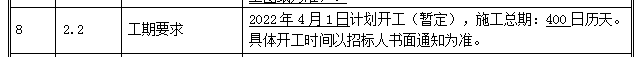 2022年4月1日计划开工(暂定),施工总期为400日历天,具体开工时间以招标人书面通知为准。