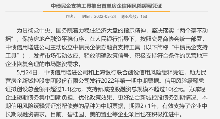 5月24日,中债信用增进投资股份有限公司(以下简称中债信用增进公司)公告称,其和上海银行联合创设信用风险缓释凭证,助力民营房企新城控股集团股份有限公司(以下简称新城控股)发行2022年排名前列期中期票据。