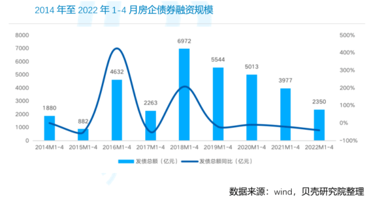 从整体情况看,房企融资基本面目前仍然不容乐观。据贝壳研究院统计,今年1-4月房企境内、境外债券融资累计约2350亿元,同比下降41%,降幅较今年一季度收窄2个百分点。其中,4月境内债券融资530亿元,环比减少25.4%,同比减少32.7%。