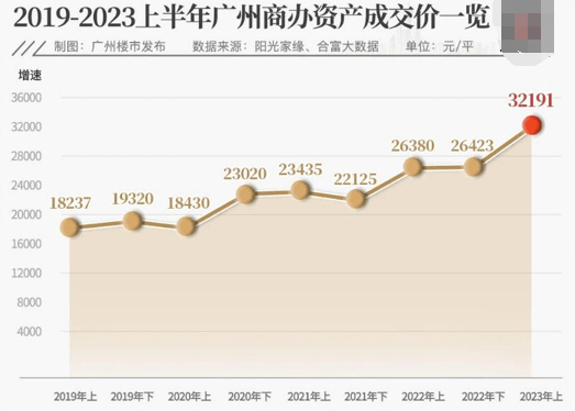 今年上半年广州商办物业成交均价达32191元/平,首次突破了3万大关,创下近5年新高。(数据来源:合富研究院)