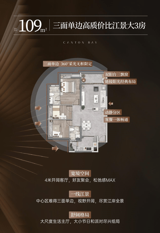 建面约109㎡江景三房以约4米奢阔开间,打造IMAX级观景视野。餐客一体厅、行政级主卧与观景阳台形成黄金三角区,270°环幕式尽揽珠江的晨昏流转与都市的霓虹璀璨,每日居家即享千万级景观藏品。