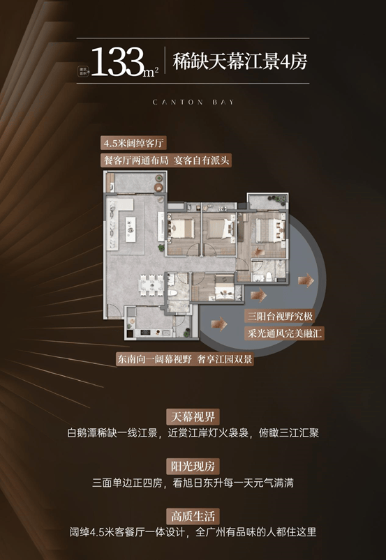建面约133㎡四房户型4.5米环幕式客厅与巨幅观景窗构成黄金比例,外接约7.8米观景阳台,形成"江-厅-阳"三重空间对话。三阳台矩阵如悬浮于江面的玻璃盒子,既保证三代同堂的私密边界,又通过270°环幕视野将珠江的晨雾夕照引入每个生活场景。