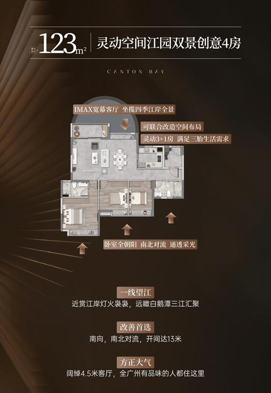 建面约123㎡南向四开间江景户型,4.5米阳光横厅搭配三面单边采光系统,全屋浸润在珠江的粼粼波光中。动静分离的双洄游动线,让三代同堂既能共享天伦之乐,又能各得其所。