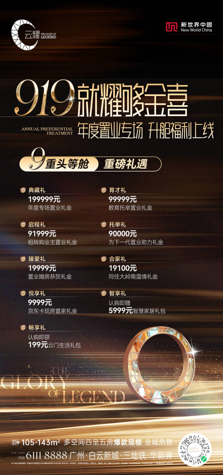 凭借当前TOP1热销势头,新世界云耀趁热推出“919就耀够金喜”年度置业专场,将此前的抢跑919六重礼遇,全面升舱至九重头等舱礼遇。其中包含199999 元年度专场置业礼金、99999 元教育托举置业礼金、91999 元租转购业主置业礼金等大额置业补贴,让购房者在享受真实价值的同时,更能收获实实在在的优惠。