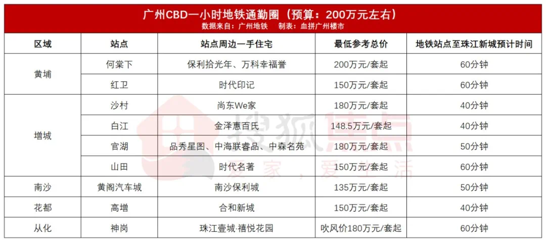 其中,轨道沿线的住宅项目便直接享有这一交通利好,通勤条件获得极大改善。去年底,血拼哥曾整理过广州CBD一小时通勤圈内总价约200万元的一手住宅,其中不乏有黄埔知识城、南沙黄阁、增城新塘及从化太平等热门板块,有兴趣的刚需朋友不妨可以关注一二。