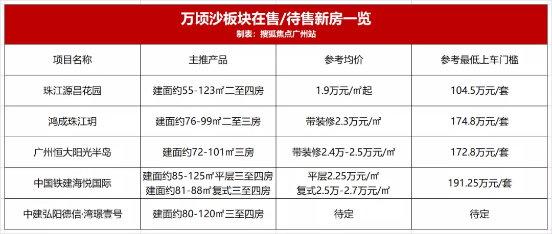 当前,万顷沙板块在售/待售一手住宅约5个,较低上车门槛约104.5万元/套,适合预算紧张的刚需朋友。